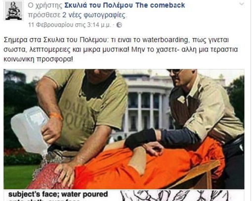 «Σήμερα τα Σκυλιά του πολέμου: Τι είναι το waterboarding, πως γίνεται σωστά, λεπτομέρειες και μικρά μυστικά – Άλλη μια τεράστια κοινωνική προσφορά» (δείχνουν σε συναδέλφους τους πώς να χρησιμοποιούν το βασανιστήριο του πνιγμού.)