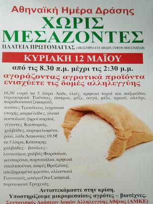 Δράση Χωρίς Μεσάζοντες στο κέντρο της Αθήνας, την Κυριακή 12/5/2019, στην πλατεία Πρωτομαγιάς (Δικαστήρια Ευελπίδων, γέφυρα Μουστοξύδη), από τις 8.30πμ έως τις 2.30μμ.