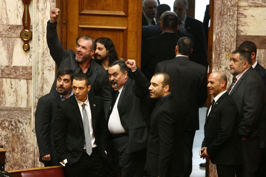 Σημεία των καιρών. Με υψωμένες γροθιές και όχι τον κλασικό ναζιστικό τους χαιρετισμό οι χρυσαυγίτες στη Βουλή |
