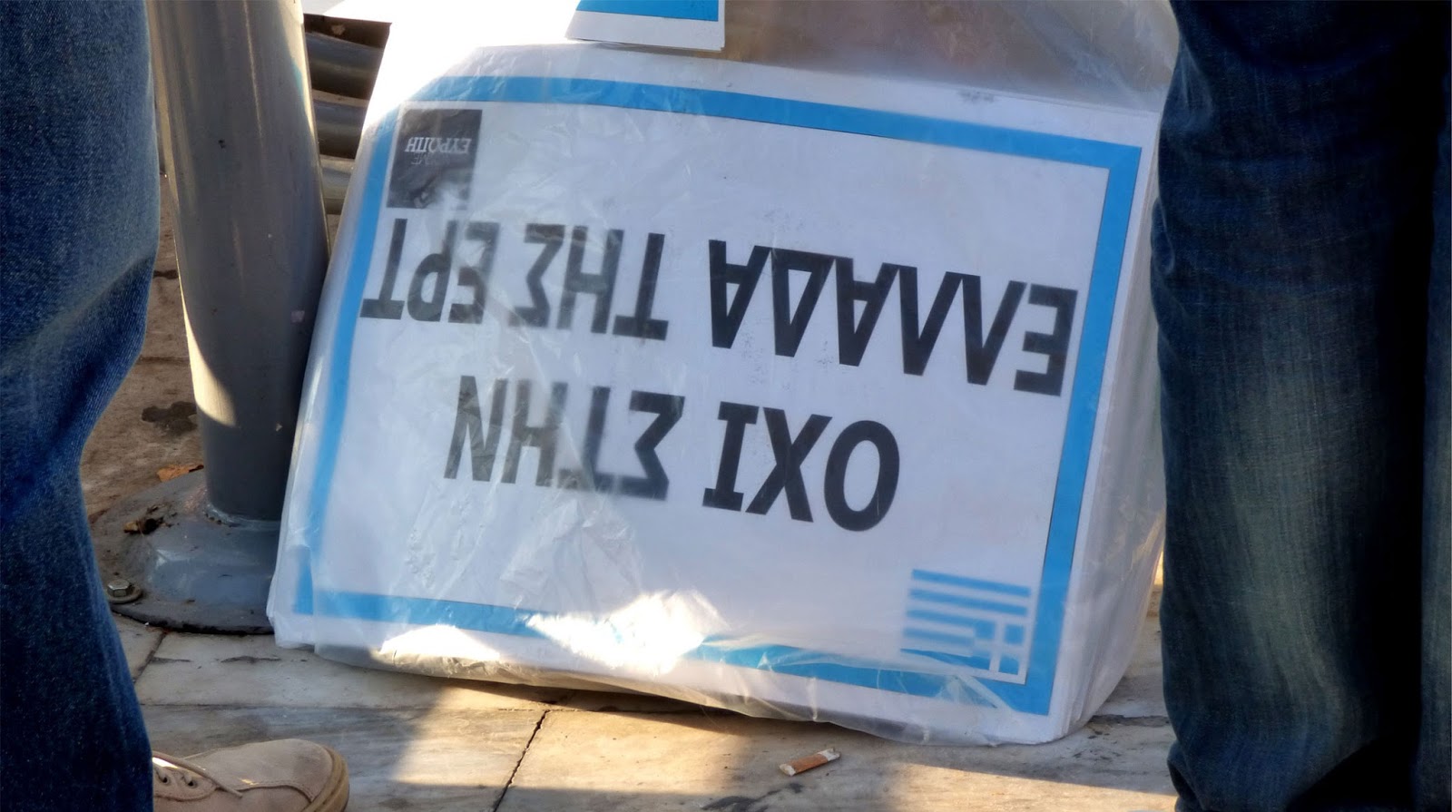 μάλιστα επάνω τους και το logo του «Μένουμε Ευρώπη». Τα πλακάτ αυτά