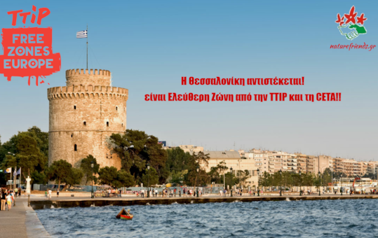 Η Θεσσαλονίκη είναι ο 6ος Δήμος της χώρας μας που κηρύχθηκε στις 16 Μαΐου 2016, με συντριπτική πλειοψηφία από το Δημοτικό Συμβούλιο, Ελεύθερη Ζώνη από τις  ληστρικές Εμπορικές συμφωνίες TTIP CETA.