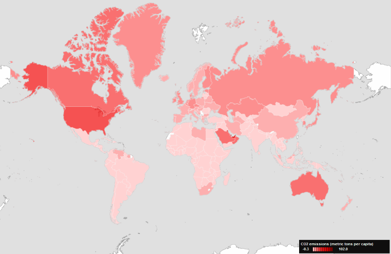 Σχήμα 11. Γεωγραφική κατανομή των κατά κεφαλή εκπομπών CO2 (μετρικοί τόνοι CO2 κατά κεφαλή) στον πλανήτη [10]