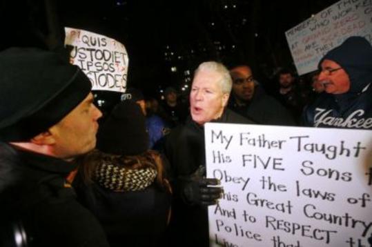 Οι υποστηρικτές των αστυνομικών συνέχιζαν να φωνάζουν συνθήματα όσο πιο δυνατά μπορούσαν για να καλύψουν τις φωνές των αντι-διαδηλωτών, όπως: