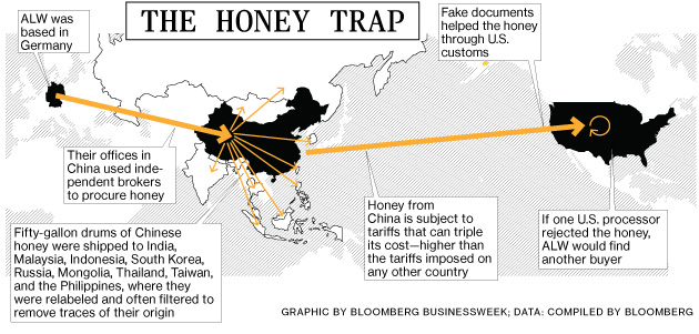 Το 2006, μέλη του Υπουργείου Εσωτερικής Ασφάλειας των ΗΠΑ (DHS), εισβάλουν στα γραφεία του υποκαταστήματος της Γερμανικής εταιρείας Alfred L. Wolff στο Σικάγο και διεξάγουν έρευνα. Αυτά που θα ανακαλύψουν θα μείνουν στην ιστορία ως το μεγαλύτερο διατροφικό σκάνδαλο στην ιστορία των ΗΠΑ. Η Susan Berfield έχει γράψει ένα εξαιρετικό χρονικό της υπόθεσης στο Bloomberg. Η Γερμανική εταιρεία, ένας από τους μεγαλύτερους προμηθευτές της βιομηχανίας τροφίμων παγκοσμίως, λειτουργούσε ως μεσάζοντας ώστε να φτάνει το Κινέζικο μέλι στις ΗΠΑ, αποφεύγοντας τους δασμούς.