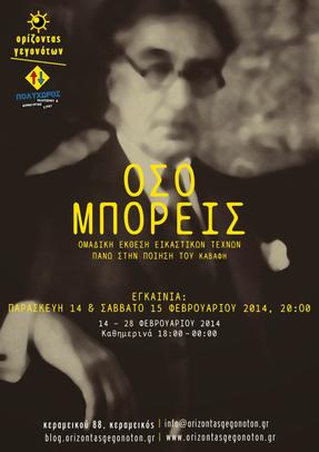Στον “Ορίζοντα των Γεγονότων”, Κεραμικού 88   καθ’ όλην τη διάρκεια της εβδομάδος και έως τις 28/02, ομαδική έκθεση εικαστικών τεχνών πάνω στην ποίηση του Καβάφη, σε συνεργασία με τον  ΠΟΛΥΧΩΡΟ ΠΟΛΙΤΙΣΜΟΥ & ΔΗΜΙΟΥΡΓΙΑΣ ΣΥΡΟΥ