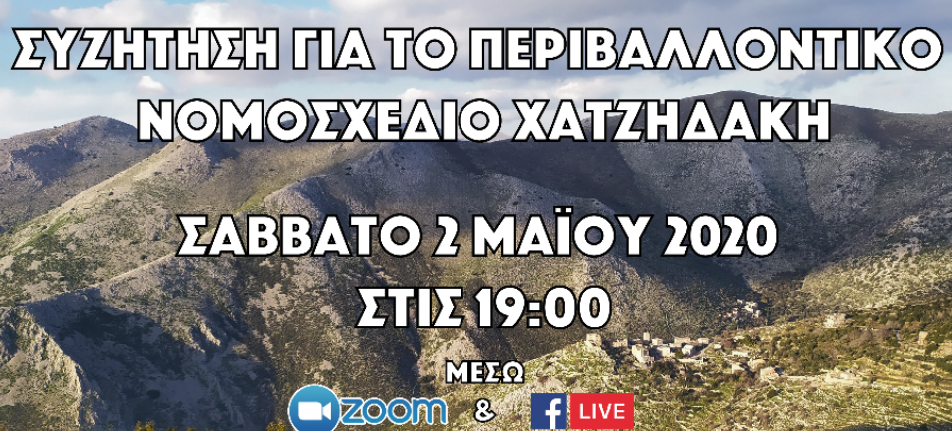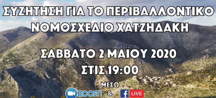 To Σάββατο 2 Μαΐου 2020 στις 19:00 διοργανώνεται διαδικτυακή συζήτηση για το περιβαλλοντικό νομοσχέδιο Χατζηδάκη από την περιβαλλοντική πρωτοβουλία «Κοινά Υπό Κατοίκηση», την περιβαλλοντική οργάνωση «Καλλιστώ», την «Ελληνική Ορνιθολογική Εταιρεία», την «Ελληνική Εταιρία Προστασίας της Φύσης» και την περιβαλλοντική εταιρεία «Μάμα Γη».