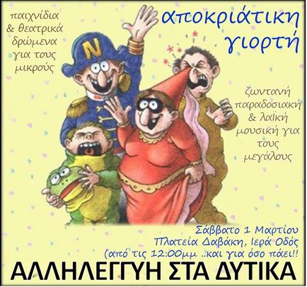 Αυτό το Σάββατο 1 Μαρτίου η Αποκριάτικη Γιορτή μας στην πλατεία Δαβάκη, στην Ιερά οδό κοντά στον σταθμό Αγία Μαρίνα του μετρό.