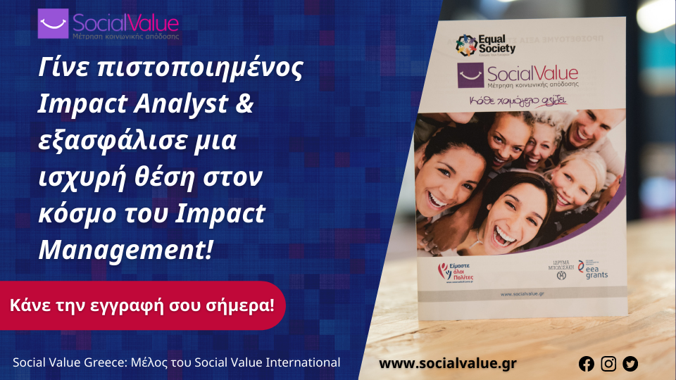 H Equal Society σε προσκαλεί στον κόσμο του impact management και σε συνεργασία με την Efiko Academy, το Social Value Greece και το Social Value International προσφέρει μια σειρά από διαδραστικά, online courses από όπου θα λάβεις την ανταγωνιστική και σύγχρονη πιστοποίηση του Impact Analyst.
