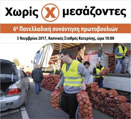 Εμείς, οι πολίτες και οι παραγωγοί που τα τελευταία 5 χρόνια γεννήσαμε και μεγαλώσαμε τις αγορές «Χωρίς Μεσάζοντες» θα συναντηθούμε την Κυριακή 5 Νοεμβρίου 2017, στις 10:00 το πρωί στον Καπνικό Σταθμό Κατερίνης για να συζητήσουμε και να αποφασίσουμε τα επόμενα βήματα μας.