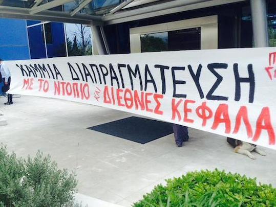 Οι καταληψίες έχουν κρεμάσει πανό: “Καμία διαπραγμάτευση με το ντόπιο και διεθνές κεφάλαιο”.