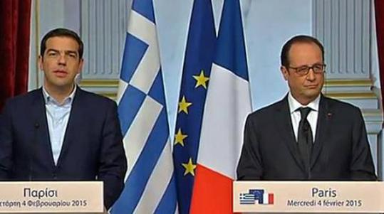 Την ανάγκη σεβασμού της ψήφου του ελληνικού λαού αλλά και των ευρωπαϊκών κανόνων και των δεσμεύσεων που έχουν αναληφθεί, σημειώσε ο Φρανσουά Ολάντ μετά τη συνάντηση που είχε με τον Έλληνα πρωθυπουργό Αλέξη Τσίπρα. Σύμφωνα με το Γάλλο Πρόεδρο πρέπει να υπάρξει διάλογος για κοινή συμφωνία καθώς «είμαστε όλοι υπεύθυνοι για ένα κοινό νόμισμα». «Έχουμε συγκεκριμένο και εφαρμόσιμο πρόγραμμα που δεν απειλεί την Ευρώπη» τόνισε από την πλευρά του ο Αλέξης Τσίπρας. Παράλληλα, εκτίμησε ότι «έχουμε βρει ανοιχτά ώτα στις προτάσεις που έχουμε καταθέσει και θα εργαστούμε από κοινού προκειμένου ξεπερνώντας την κρίση στην Ελλάδα να δώσουμε την ώθηση για να ξεπεράσει και η Ευρώπη την κρίση» (διαβάστε αναλυτικά παρακάτω).