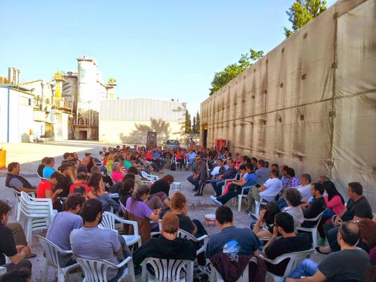 Το πρωί της Κυριακής 11/5 πραγματοποιήθηκε μεγάλη συνέλευση Αλληλέγγυων υποστηρικτών/τριών απ’ όλη την Ελλάδα με την συμμετοχή των εργαζομένων. Αλληλέγγυες και αλληλέγγυοι συναγωνιστές/τριες βρέθηκαν στον χώρο του εργοστασίου από Αθήνα, Πάτρα, Γιάννενα, Έδεσσα, Ξάνθη, Κρήτη, Λάρισα, Βόλο, Πρέβεζα, Δράμα, Σπάρτη, Κομοτηνή και Θεσσαλονίκη.